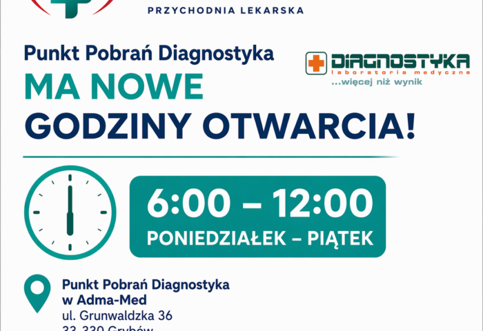 Nowe godziny otwarcia Punktu Pobrań Diagnostyka w Adma-Med!